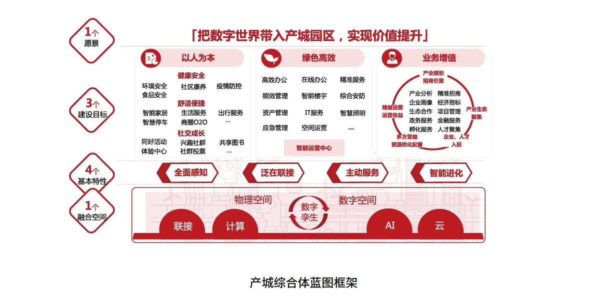 建設目標,基于以人為本、綠色高效、業務增值,可圍繞產城綜合體作進一步深化設計,以人為本體現在健康安全、舒適便捷和社交成長等;綠色高效可根據產城綜合體的主要業態,分別從高效辦公、精準服務、智慧能效空間運營等場景展開設計;業務增值可從產業規劃、生態發展、資源優化配置以及精益運營等領域規劃,實現與產城綜合體相匹配的智慧化服務體系和平臺支撐體系。融合空間與全面感知、泛在聯接、主動服務和智能進化等基本特征,作為支撐產城綜合體的基礎,可結合產城綜合體承載的人機物事的具體需求進行詳細規劃。這樣我們就可以定制出指導產城綜合體園區智慧化規劃的完整的"1-3-4-1"藍圖框架(如圖所示)。
