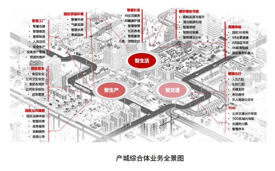 基于藍圖框架,圍繞產城綜合體中社區、工廠、樓宇、交通、環境、安全和公共服務等場景,可以全面勾勒出未來產城綜合體的全景圖(如圖所示)。